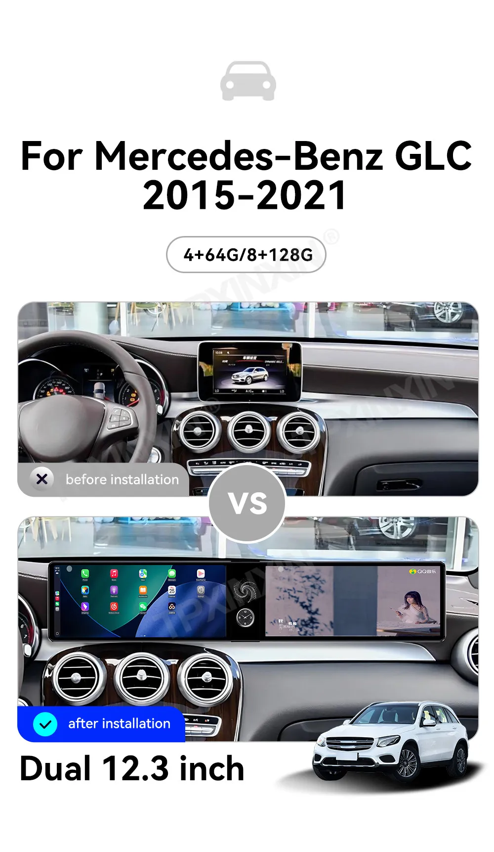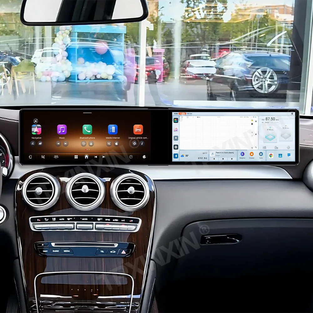 Give your Mercedes‑Benz a premium infotainment transformation with this 24.6″ dual widescreen wireless CarPlay & Android Auto upgrade, designed specifically for C‑Class (W205) and GLC Class (X253/C253) models from 2015–2021. This full replacement infotainment system adds modern wireless smartphone functionality with CarPlay, Android Auto, AirPlay, and more — all while preserving your vehicle’s premium interior look and OEM controls.