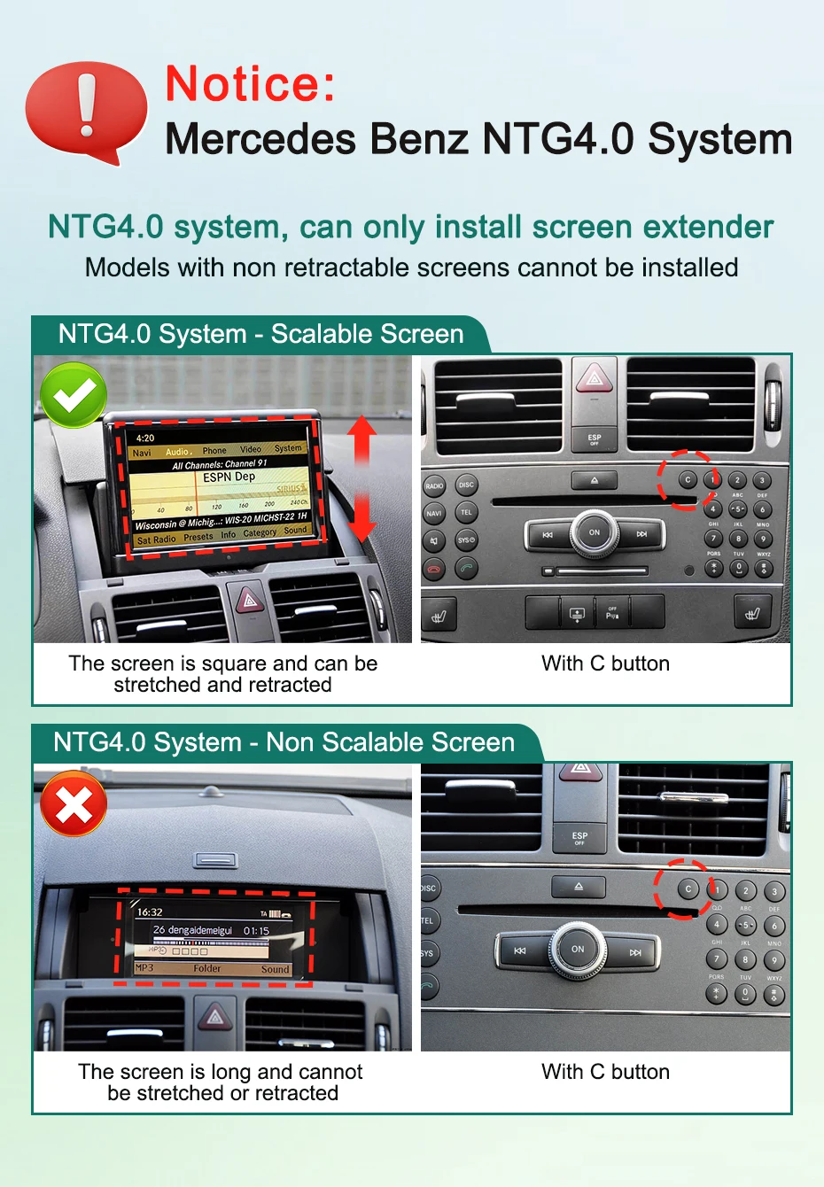 If your original car model is Mercedes Benz W204 and the screen is rectangular like in the picture, it cannot be installed. Please do not purchase。